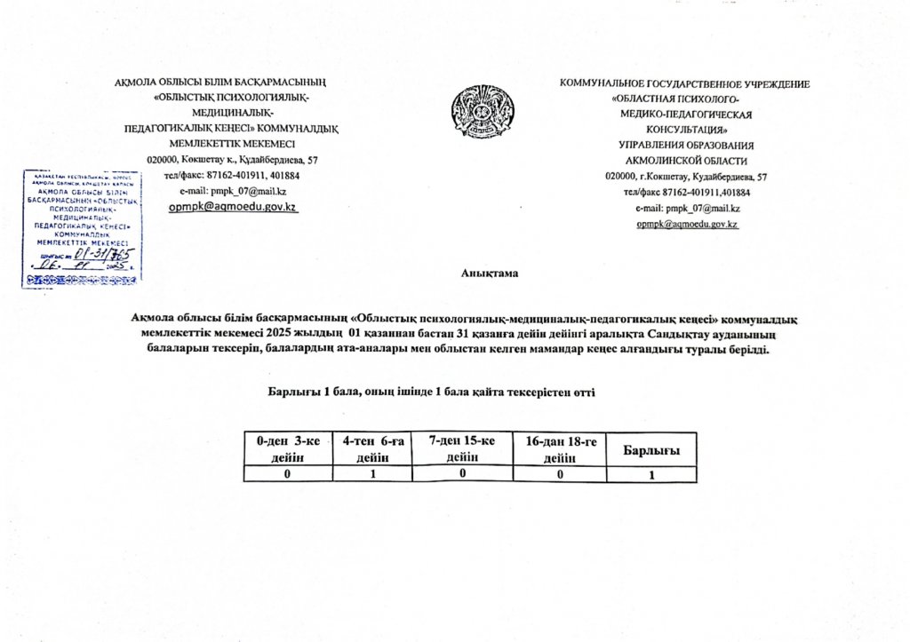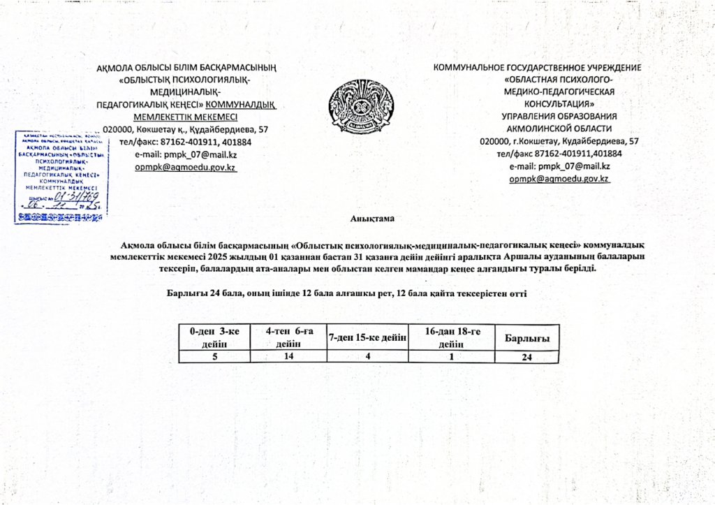 Аршалы ауданы бойынша "Облыстық психологиялық-медициналық-педагогикалық кеңесі" КММ-нің қазан айына балаларды тексеру анықтамасы