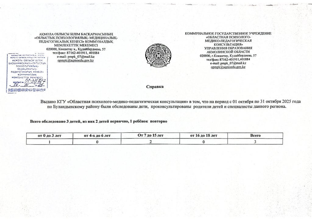 Бұланды ауданы бойынша "Облыстық психологиялық-медициналық-педагогикалық кеңесі" КММ-нің қазан айына балаларды тексеру анықтамасы
