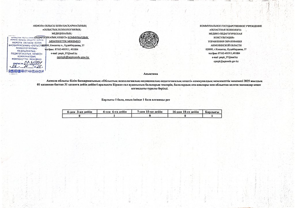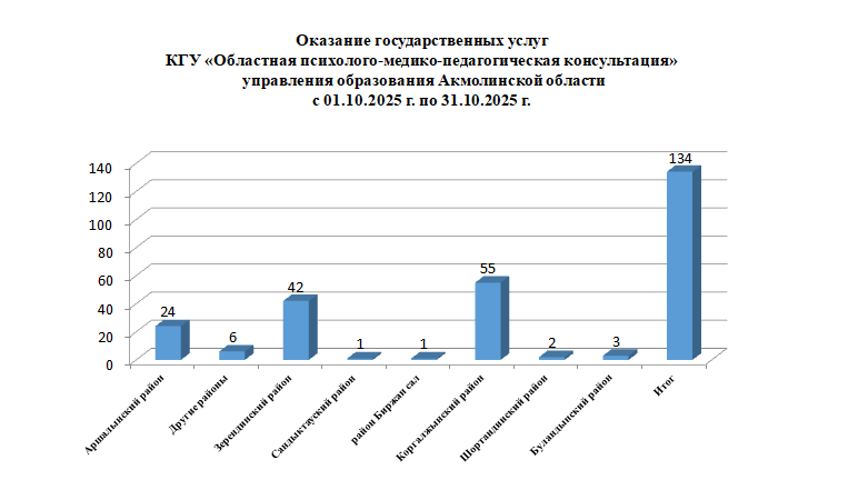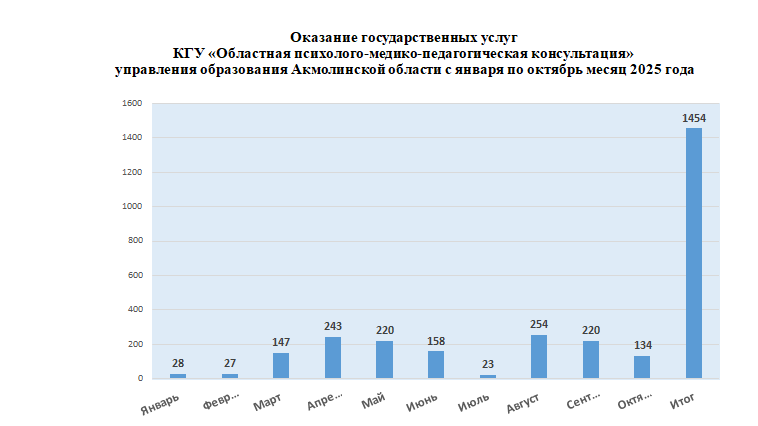 Ақмола облысы білім басқармасының "Облыстық психологиялық-медициналық-педагогикалық кеңесі" КММ 2025 жылдың қаңтар-қазан айлары аралығында мемлекеттік қызмет көрсету.