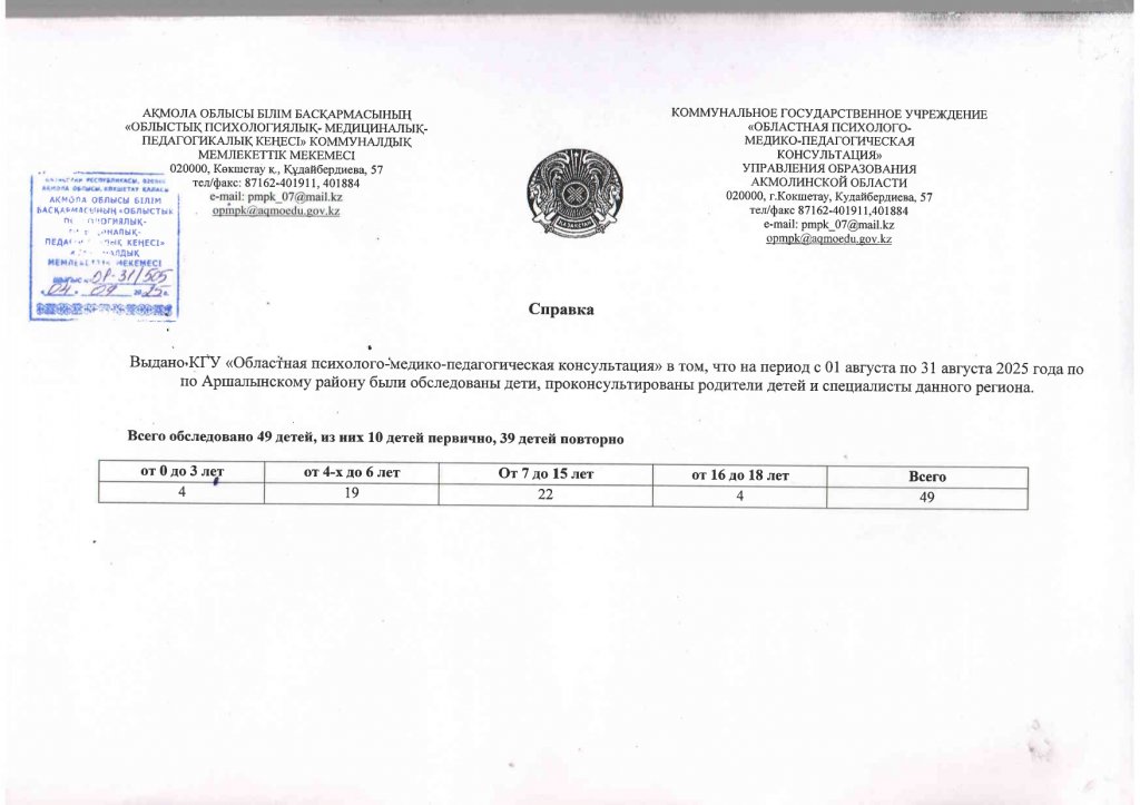 Аршалы ауданы бойынша "Облыстық психологиялық-медициналық-педагогикалық кеңесі" КММ-нің тамыз айының балаларды тексеру анықтамасы