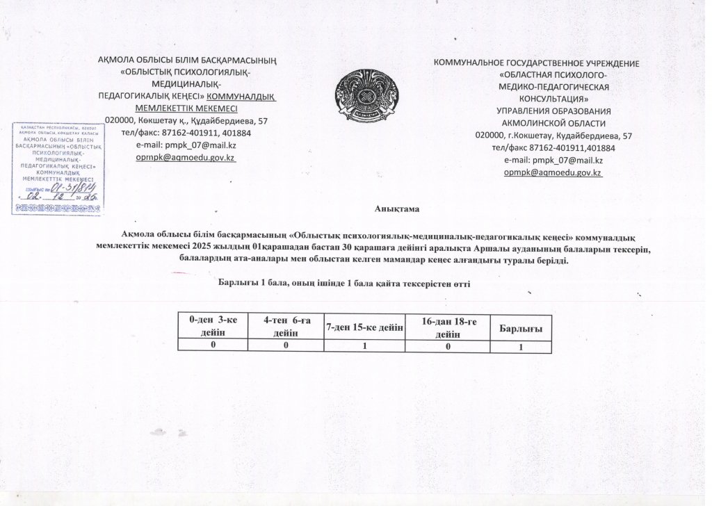 Аршалы ауданы бойынша "Облыстық психологиялық-медициналық-педагогикалық кеңесі" КММ-нің қараша айына балаларды тексеру анықтамасы