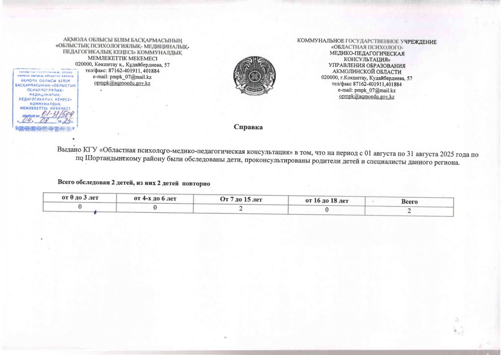 Шортанды ауданы бойынша "Облыстық психологиялық-медициналық-педагогикалық кеңесі" КММ-нің тамыз айына балаларды тексеру анықтамасы