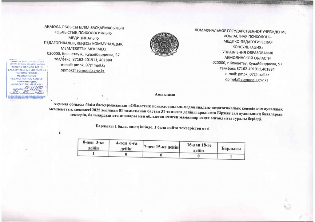 Біржан сал ауданы бойынша "Облыстық психологиялық-медициналық-педагогикалық кеңесі" КММ-нің тамыз айына балаларды тексеру анықтамасы