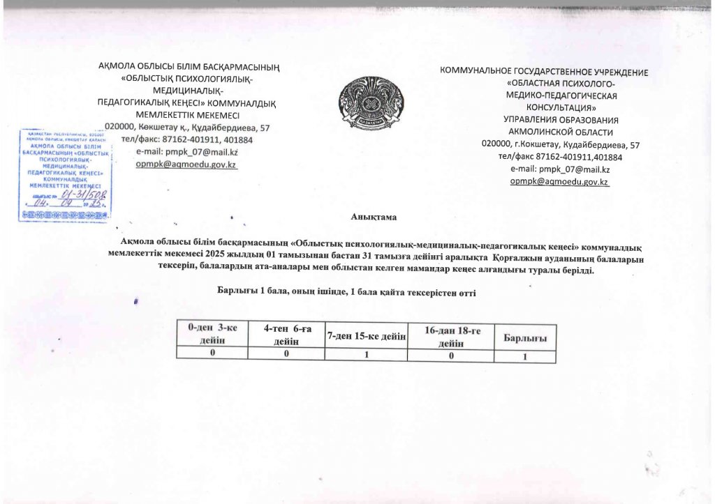 Қорғалжын ауданы бойынша "Облыстық психологиялық-медициналық-педагогикалық кеңесі" КММ-нің тамыз айына балаларды тексеру анықтамасы