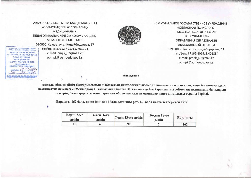 Ерейментау ауданы бойынша "Облыстық психологиялық-медициналық-педагогикалық кеңесі" КММ-нің тамыз айына балаларды тексеру анықтамасы