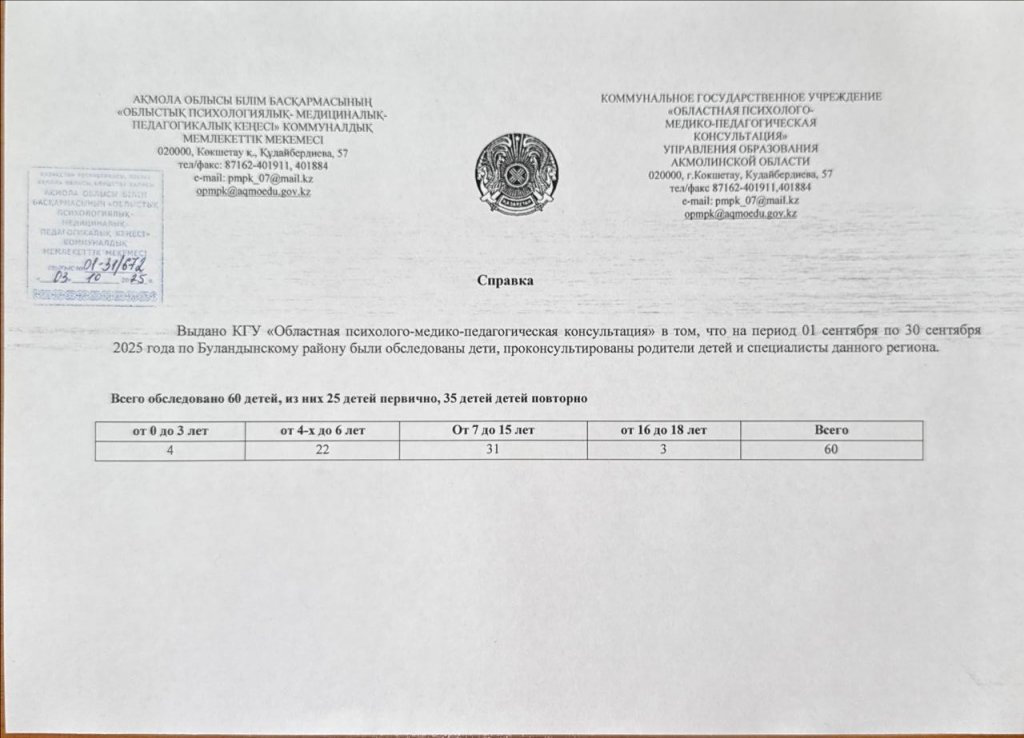 Бұланды ауданы бойынша "Облыстық психологиялық-медициналық-педагогикалық кеңесі" КММ-нің қыркүйек айына балаларды тексеру анықтамасы