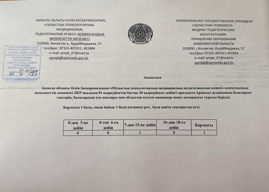 Аршалы ауданы бойынша "Облыстық психологиялық-медициналық-педагогикалық кеңесі" КММ-нің қыркүйек айының балаларды тексеру анықтамасы