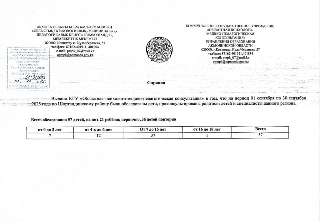 Шортанды ауданы бойынша "Облыстық психологиялық-медициналық-педагогикалық кеңесі" КММ-нің қыркүйек айына балаларды тексеру анықтамасы
