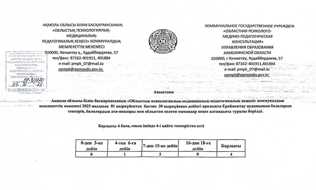 Ерейментау ауданы бойынша "Облыстық психологиялық-медициналық-педагогикалық кеңесі" КММ-нің қыркүйек айына балаларды тексеру анықтамасы