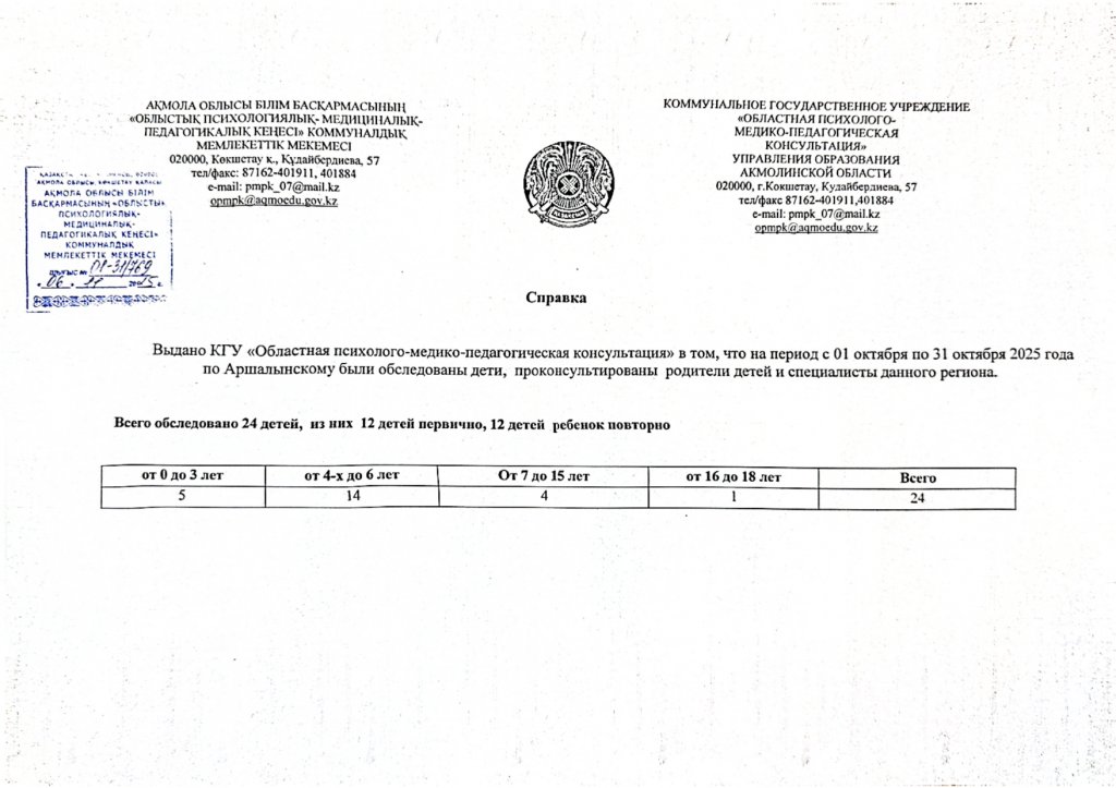 Аршалы ауданы бойынша "Облыстық психологиялық-медициналық-педагогикалық кеңесі" КММ-нің қазан айына балаларды тексеру анықтамасы