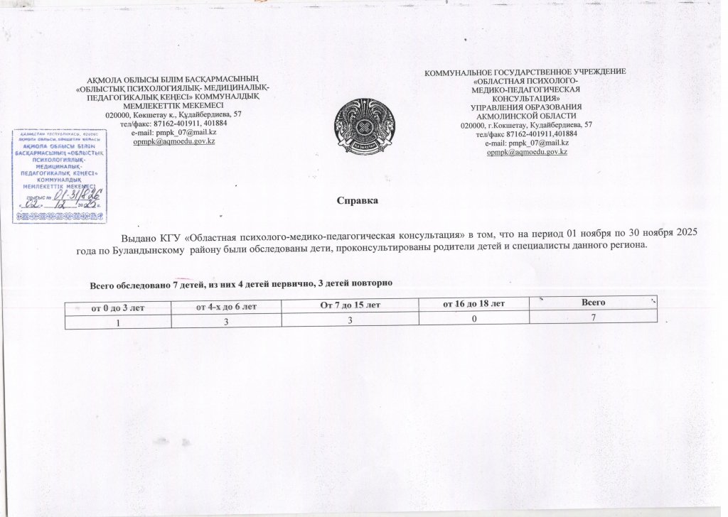 Бұланды ауданы бойынша "Облыстық психологиялық-медициналық-педагогикалық кеңесі" КММ-нің қараша айына балаларды тексеру анықтамасы