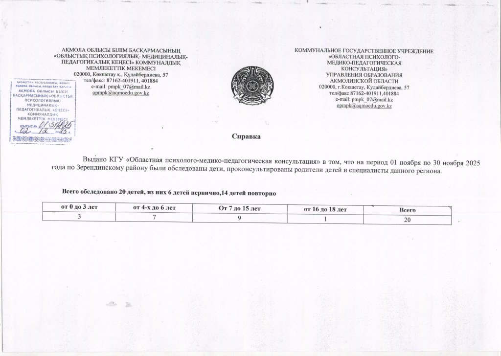 Зеренді ауданы бойынша "Облыстық психологиялық-медициналық-педагогикалық кеңесі" КММ-нің қараша айына балаларды тексеру анықтамасы