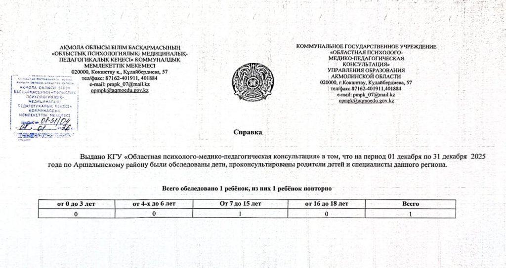 Аршалы ауданы бойынша "Облыстық психологиялық-медициналық-педагогикалық кеңесі" КММ-нің желтоқсан айына балаларды тексеру анықтамасы