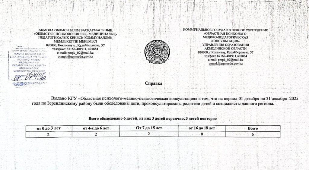 Зеренді ауданы бойынша "Облыстық психологиялық-медициналық-педагогикалық кеңесі" КММ-нің желтоқсан айына балаларды тексеру анықтамасы