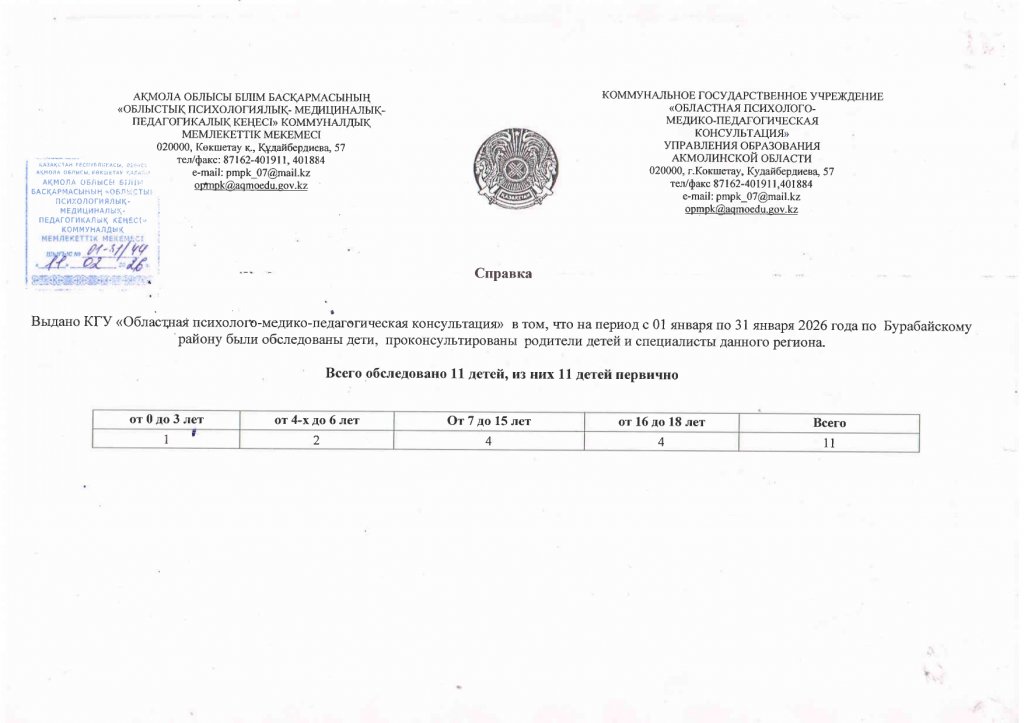 Бурабай ауданы бойынша "Облыстық психологиялық-медициналық-педагогикалық кеңесі" КММ-нің қаңтар айына балаларды тексеру анықтамасы